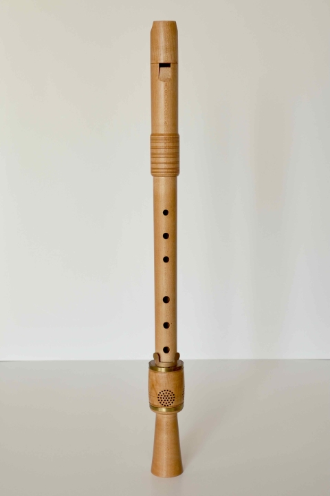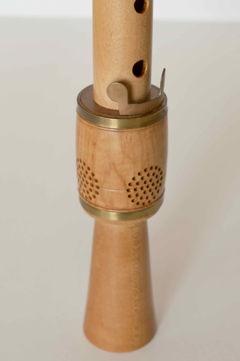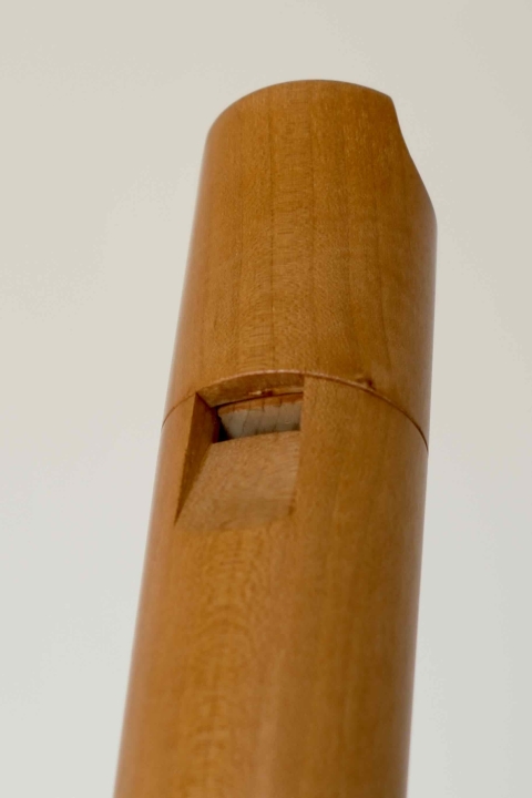 この方式は、ウィンドウェイに導かれる空気の流量が安定するため、ピッチを安定させやすく、加えて、吹き込み管のおかげで、大きな楽器でも無理のない姿勢で構えることができるというメリットがあります。